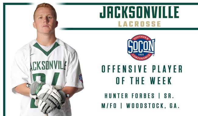 SPARTANBURG, S.C. – After a pair of jaw-dropping performances at the faceoff X for Jacksonville University men’s lacrosse, senior Hunter Forbes was named Southern Conference Offensive Player of the Week, as announced by the league Tuesday afternoon.