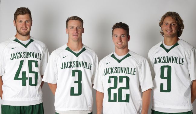 via JU press release – photo via JU web site JACKSONVILLE, Fla. – Four upperclassmen have been selected to lead Jacksonville University men’s lacrosse in the 2018 season, as seniors Ryan Beville, McLean Chicquen, Chase McIntyre, and redshirt junior Max Hartong were voted captains by their teammates, as announced by Head Coach John Galloway.“I am very proud of the four men that were selected to lead the team this season. While I believe our entire senior class carries themselves the way we want our program to be represented, these four will carry that message with fire in their hearts,” stated Galloway.“McLean and Ryan return as captains after a full season of understanding what it takes to be leaders. I expect them to take the next step as they help us build on our culture. Max and Chase have matured so much in my short time here at Jacksonville.”Chicquen and Beville served as two of the Dolphins’ five team captains in 2017. Hailing from Victoria, British Columbia, Chicquen paced JU with 35 points behind 23 goals and 12 assists, and earned Second Team All-SoCon honors following the season. Beville, a Fogelsville, Pa. native, closed out last season with a career-best 36 ground balls and four caused turnovers.“Being a captain is one of the greatest honors in sports, and I couldn’t be happier to have the privilege again,” Chicquen stated. “I learned a lot as a leader last year and I can’t wait to help take this program to new limits. I’m grateful to be able to represent JU lacrosse and I can’t wait to go to battle in 2018.”Added Beville, “Being voted captain is an amazing honor, especially here at JU for the men’s lacrosse team. Having the support and trust from the 50 guys I play with – and also my coaches – is an unexplainable feeling. I love this team and the guys involved, and I can’t wait to lead this team into the 2018 season with a full head of steam and a large amount of confidence that this will be our year.”McIntyre, a Vancouver, B.C. native and freshman during the 2014 campaign, reflected and discussed his appointment as captain four seasons later.“Being selected captain for this team is not only an honor, but a privilege. I have seen this program develop over the past five years and it has only become a more desirable place to be. We have a great new group of young guys, along with many seniors and I am extremely excited to help lead this team to the start of something special.”“I am honored to have been chosen as a captain by such a great group of guys,” added Hartong, a Canton, Ohio native who totaled five ground ball and caused six turnovers last season. “I’m proud of how hard the boys have worked this fall and extremely optimistic about what we can accomplish this spring.”“I was thrilled when their peers recognized them for their efforts,” added Galloway. “I am a lucky guy to be their coach, and look forward to working with these guys closely to help establish our culture here in Duval.”The Dolphins open up the 2018 season Feb. 4 at D.B. Milne Field against Navy, with opening face-off slated for noon.