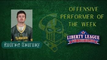 Senior Andrew Kearney had a solid week for the Clarkson University Men’s Lacrosse team and he was picked as the Liberty League Offensive Performer of the Week when the conference announced its weekly award winners on Monday afternoon.