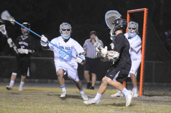 Pope John Paul took the lead at 8:31 as Ryan McMahon took off from near midfield and came straight down the field, scoring from about ten yards out for 1-0. Jensen then went on a 4-goal run. At 7:04 VanWagner took a feed on the right crease from Welsh off a fast break and finished into an open net. Then at 5:32 Walls found a loose ball on a scramble in front and scooped it in for 2-1. With 1:17 left LSM Jack Staab (who seems to inhale ground balls instead of scooping them) took off down the left wing, cut to the middle and fired home to the low left corner and just 8 seconds later Walls received a pass on the top left from Weiseman and he stepped down into it, just eluding Morfogen, who had gotten a piece of it. With 24 seconds left Castellon took advantage of an EMO, taking Patrick Brower’s right wing feed to hit the low left corner to make it 4-2 after the first.