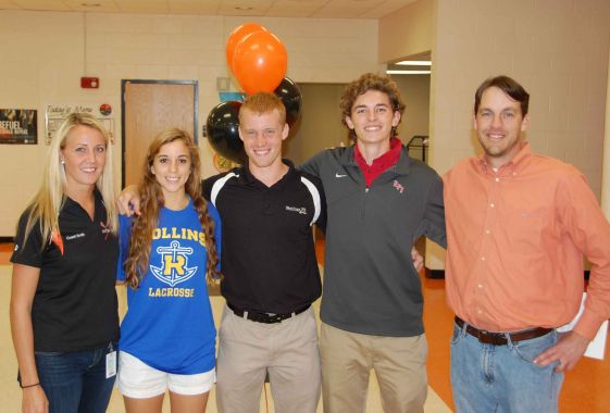 They are from left to right: Girls Head Lacrosse Coach Courtney Smith, Hannah Ricci, Lacrosse Goalie – Rollins, FL, Hunter Chadwick, Lacrosse Defense – Army, NY, Matt Krecicki, Lacrosse Attack – RPI (Rensselaer Polytechnic Institute), NY, Boys Head Lacrosse Coach, Ryan Healey.